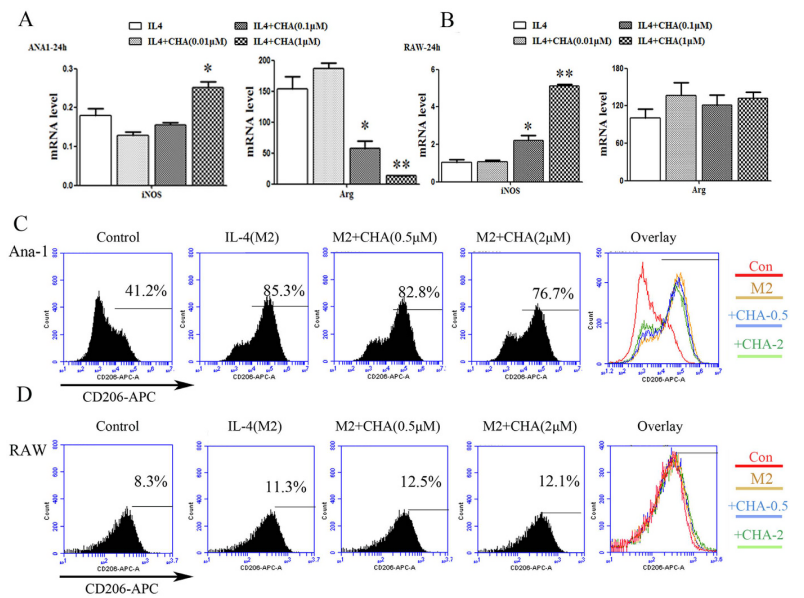 1、在體外實驗中,CHA處理顯著增加了LPS/IFNγ誘導的M1標記基因(如iNOS、MHC II和CD11c)的表達,并減少了IL-4誘導的M2標記基因(如Arg1和CD206)的表達。具體來說,CHA在1 μM濃度下顯著增加了Ana-1細胞中iNOS mRNA水平,并減少了Arg1 mRNA水平(P ≤ 0.05)。