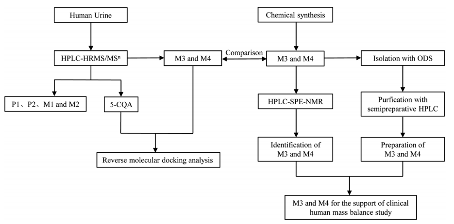 3、由于沒有商業(yè)參考品,M3和M4的純品通過5-CQA甲基化合成并進(jìn)行分離純化。合成樣品經(jīng)過HPLC分析和NMR驗(yàn)證,確認(rèn)其與尿液樣本中的M3和M4為同一化合物。