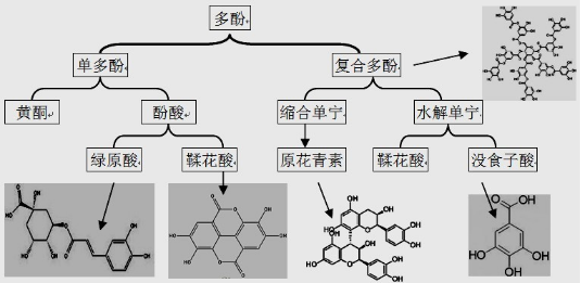 多酚,顧名思義就是分子結構具有多個酚羥基的結構,根據多酚羥基的存在形式又分為單多酚和復合多酚,詳見分類圖,結構中兩個以上的酚羥基,表現出較強的還原性,同時也表現較差的穩定性,特別是對光和熱的不穩定。