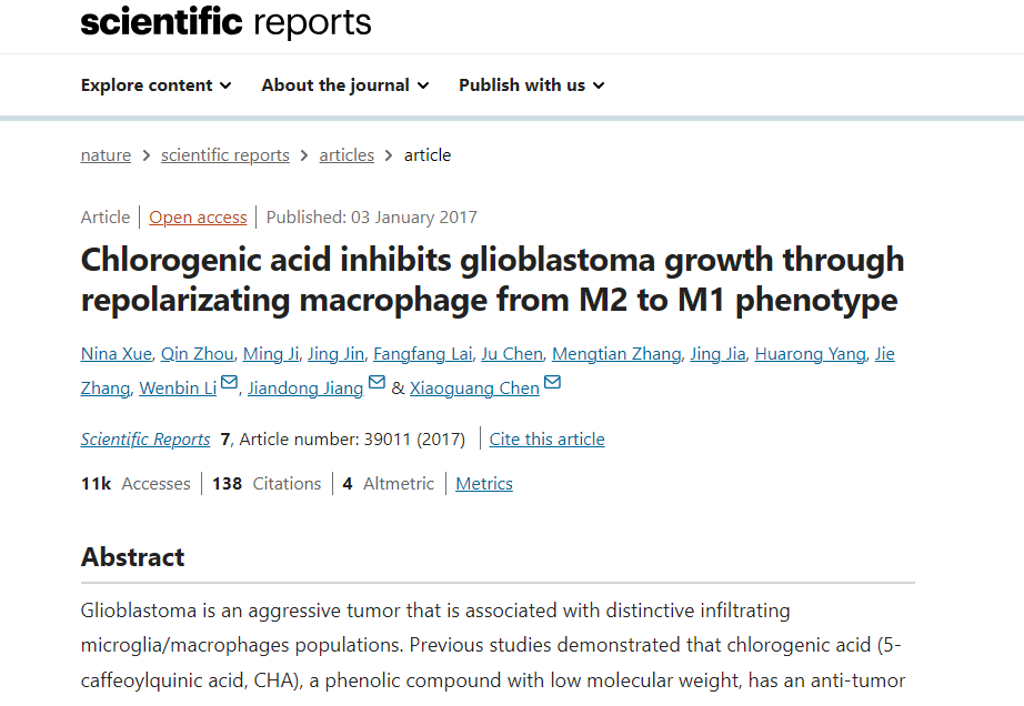 2017年1月上旬,中國醫(yī)科院藥物研究所聯(lián)合四川九章生物科技有限公司及北京世紀(jì)壇醫(yī)院腦膠質(zhì)瘤科在《Scientific Reports》 上發(fā)布了名為《Chlorogenic acid inhibits glioblastomagrowth through repolarizating macrophage from M2 to M1 phenotype》(綠原酸通過復(fù)極化使M2型巨噬細(xì)胞轉(zhuǎn)化為M1型巨噬細(xì)胞抑制惡性膠質(zhì)瘤細(xì)胞的生長)的文章,詳細(xì)闡述并論證了注射用綠原酸(四川九章生物科技有限公司研發(fā))促進惡性腫瘤細(xì)胞凋亡和抑制腫瘤生長的機制,即通過復(fù)極化上調(diào)腫瘤相關(guān)巨噬細(xì)胞M1表型,抑制腫瘤相關(guān)巨噬細(xì)胞M2表型,同時促進M2型巨噬細(xì)胞向M1型巨噬細(xì)胞的轉(zhuǎn)化。
