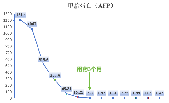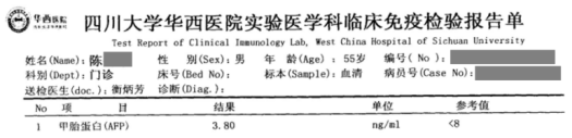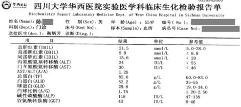 患者用藥前影像學檢查報告顯示肝多發(fā)囊腫,甲胎蛋白(AFP)高達1210ng/ml(大面積肝壞死),醫(yī)院建議必須換肝,而且還不能保證患者是否可以獲得有效治療。 患者未采用手術(shù),隨后5年期間,患者長期使用注射用綠原酸,未使用其他任何治療;5年后改為口服保健食品九樟牌咀嚼片(每年注射1個療程注射用綠原酸)。維持至今,患者各項指標均保持正常水平,身體狀況良好,與常人無異。