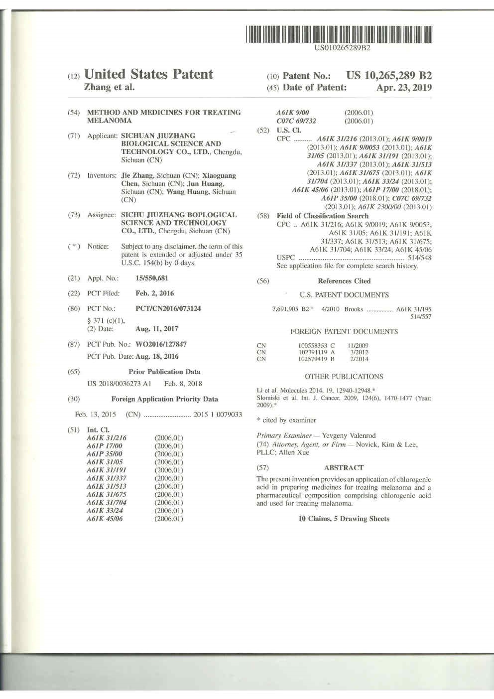 美國-PCT-CN2016-073124 綠原酸在制備治療黑色素瘤的藥物中的用途及治療黑色素瘤的藥物