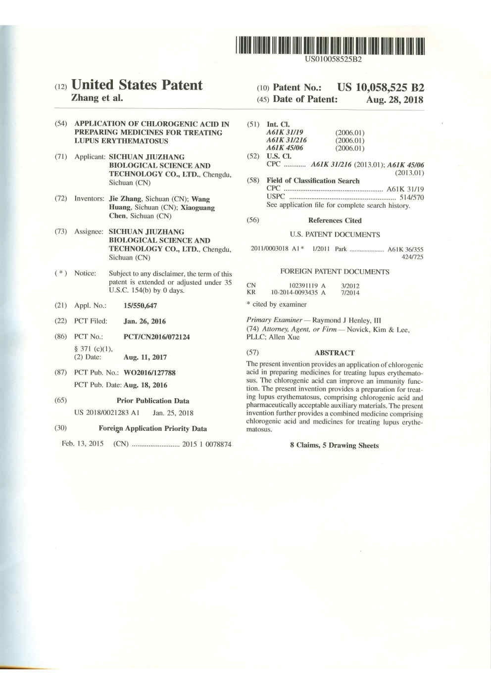 美國-PCT-CN2016-072124 綠原酸在制備治療紅斑狼瘡的藥物中的用途
