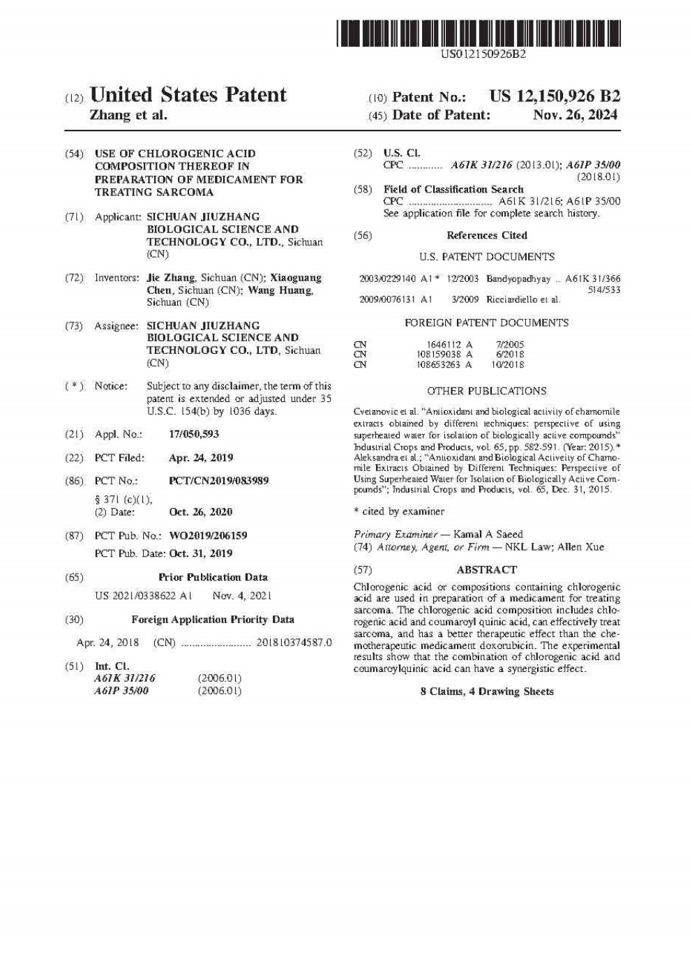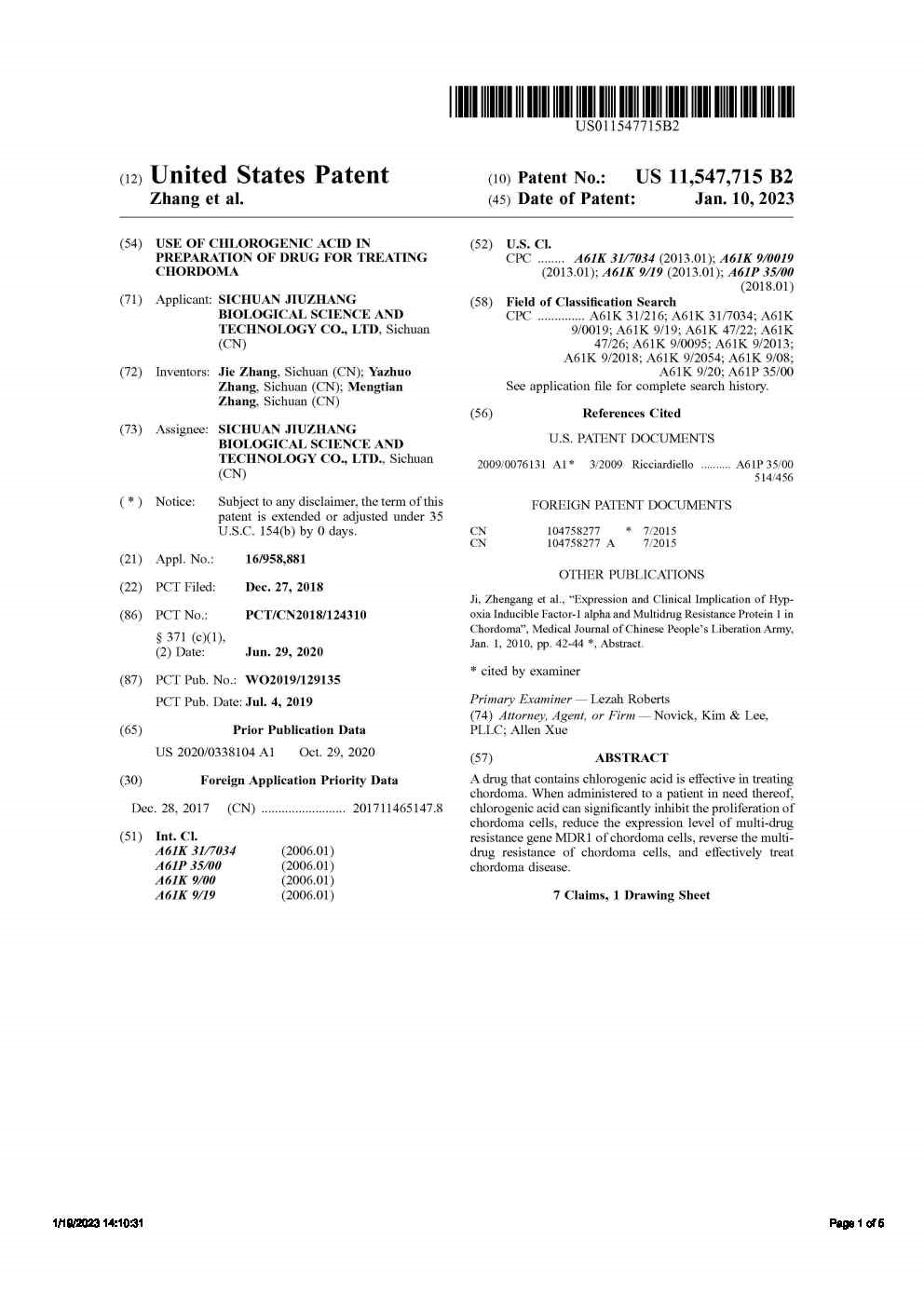 美國-PCT-CN2018-124310 綠原酸在制備治療脊索瘤的藥物中的用途