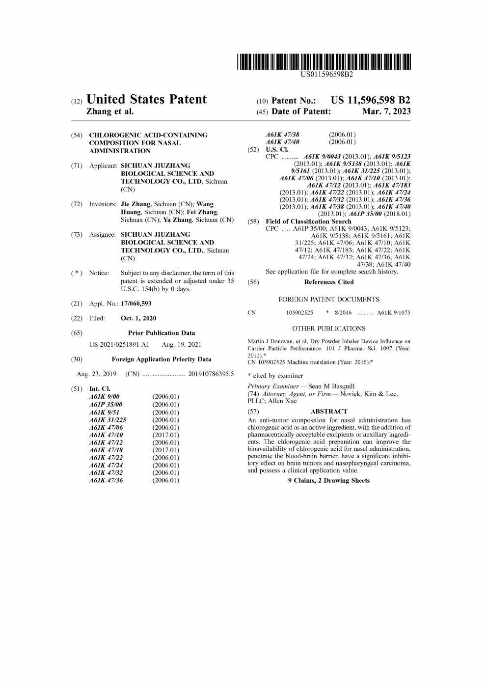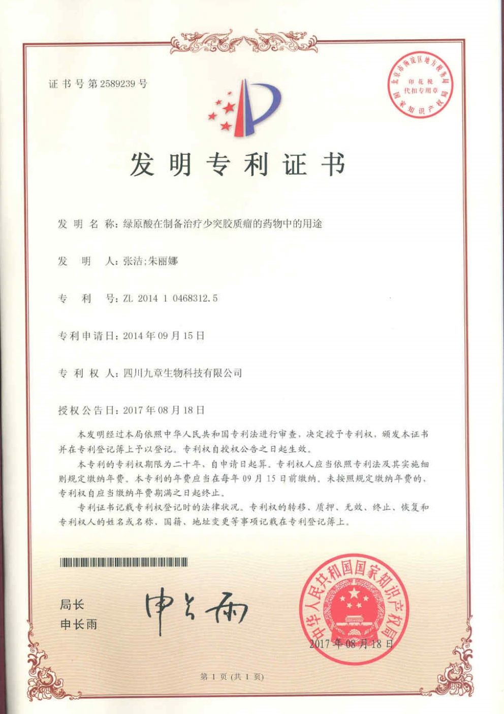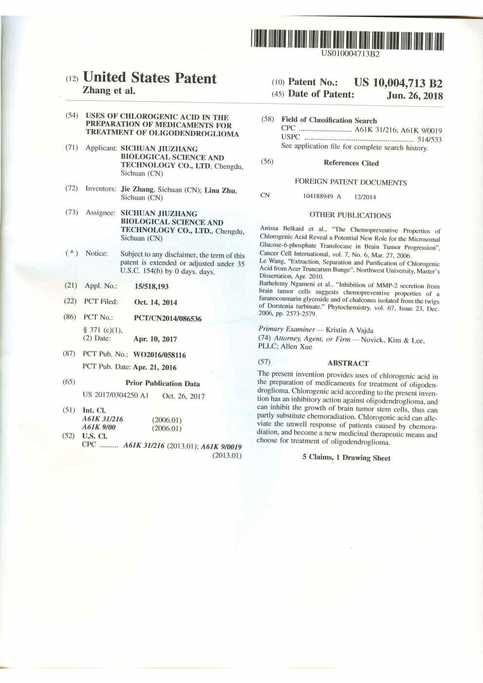 美國-PCT-CN2014-086536 綠原酸在制備治療少突膠質瘤的藥物中的用途