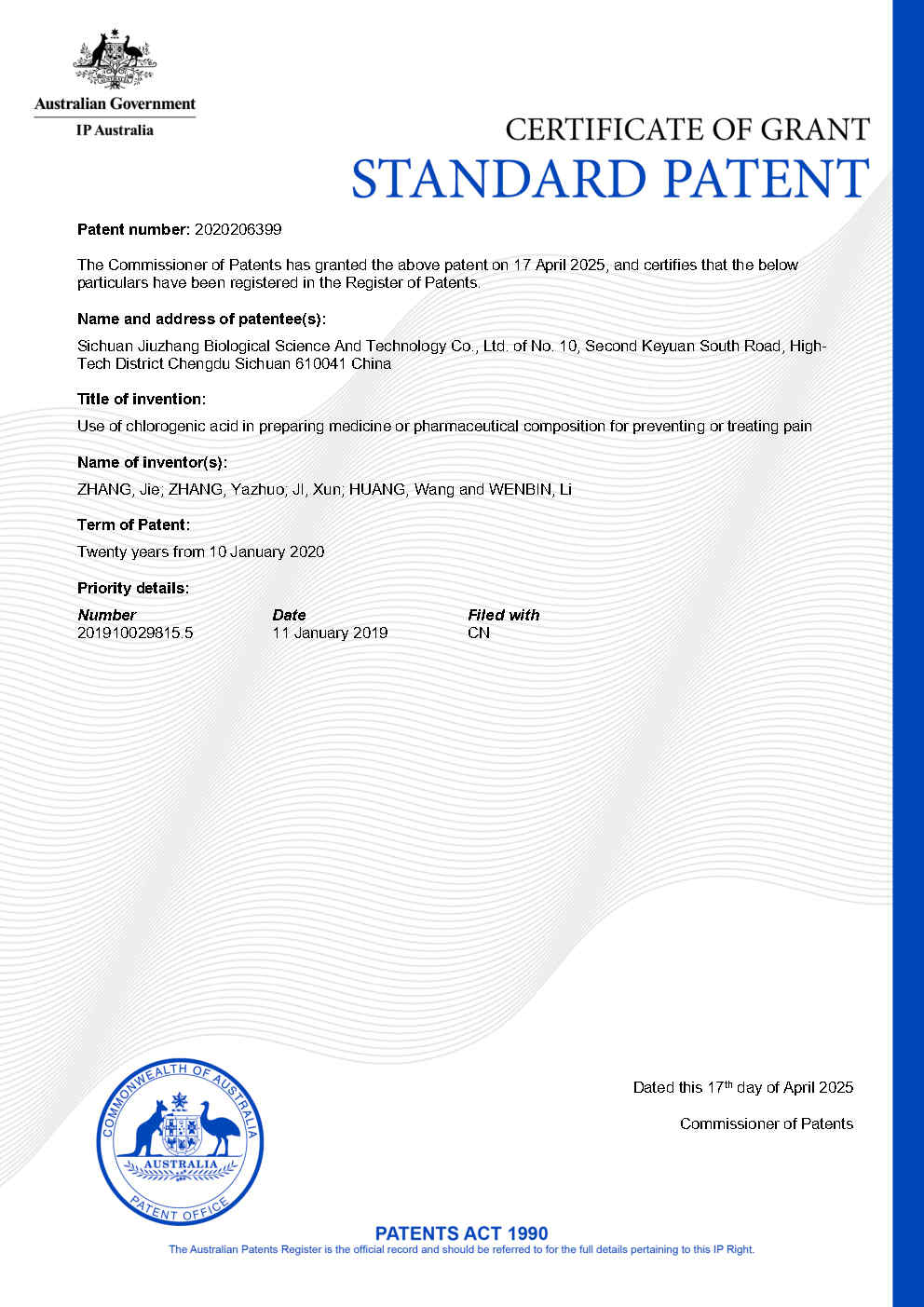 澳大利亞-PCT-CN2020-071345-綠原酸在制備預防或治療疼痛的藥物或藥物組合物中的用途