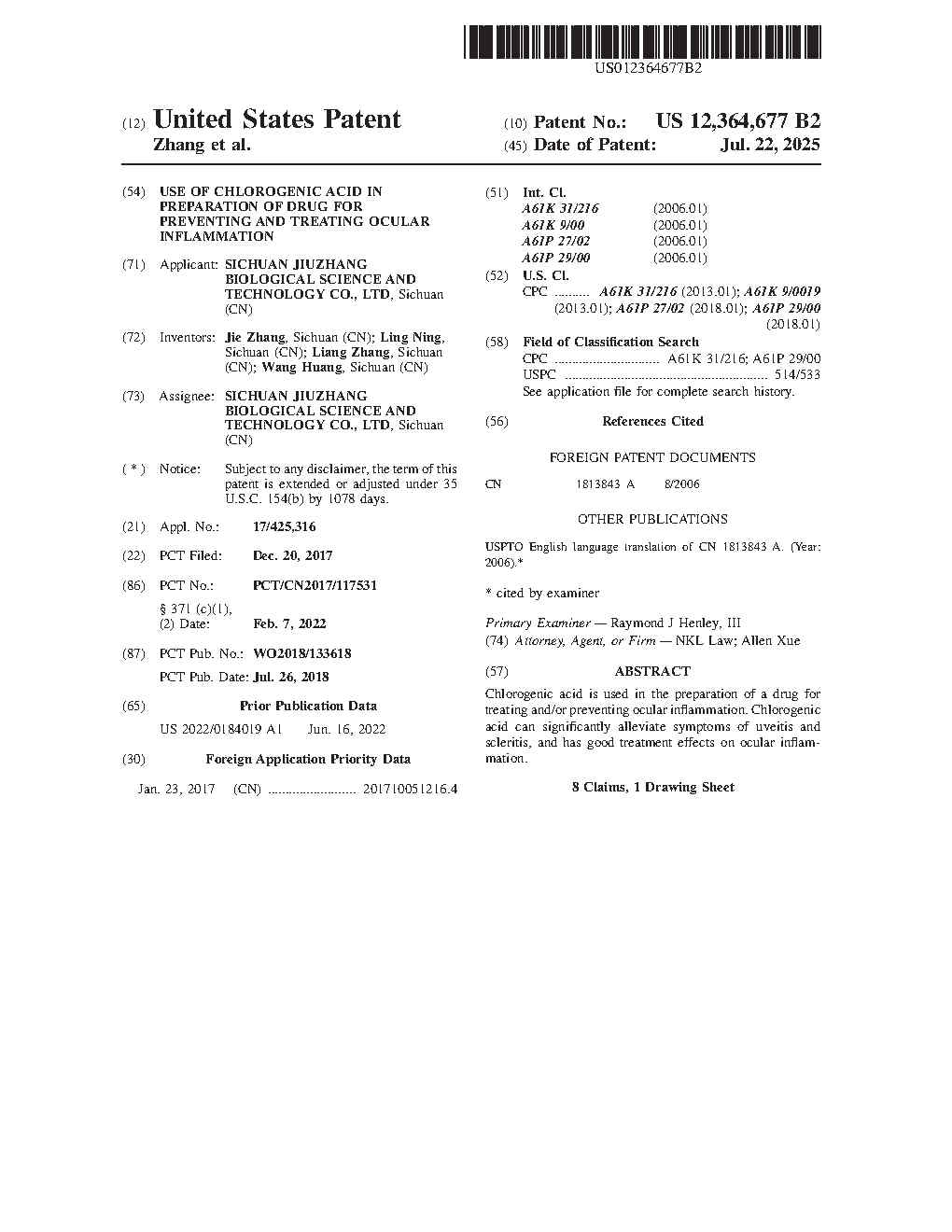 美國-PCT-CN2017-117531 綠原酸在制備防治眼部炎癥的藥物中的用途