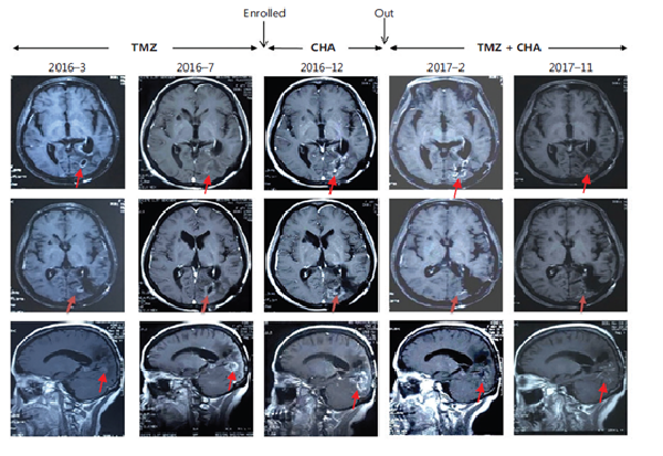 病例圖片來源 Kang, Z. , Li, S. , Kang, X. , Deng, J. , Yang, H. , & Cheni, F. , et al. (2023). Phase Ⅰ study of chlorogenic acid injection for recurrent high-grade glioma with long-term follow-up. 癌癥生物學與醫學:英文版, 20(6), 465-476.