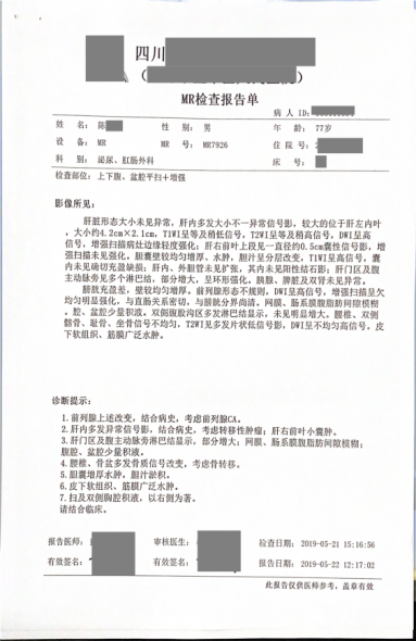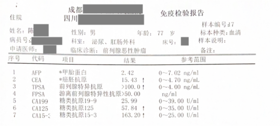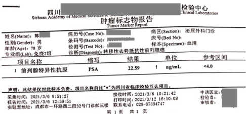 用藥前,患者診斷為前列腺惡性腫瘤,腫瘤標志物前列腺特異性抗原高達100以上。隨后聯(lián)合注射用綠原酸和抗前列腺癌藥物治療。用藥1年7個月期間,前列腺特異性抗原逐漸下降至22.59,生活質(zhì)量改善。22年1月因新冠去世。