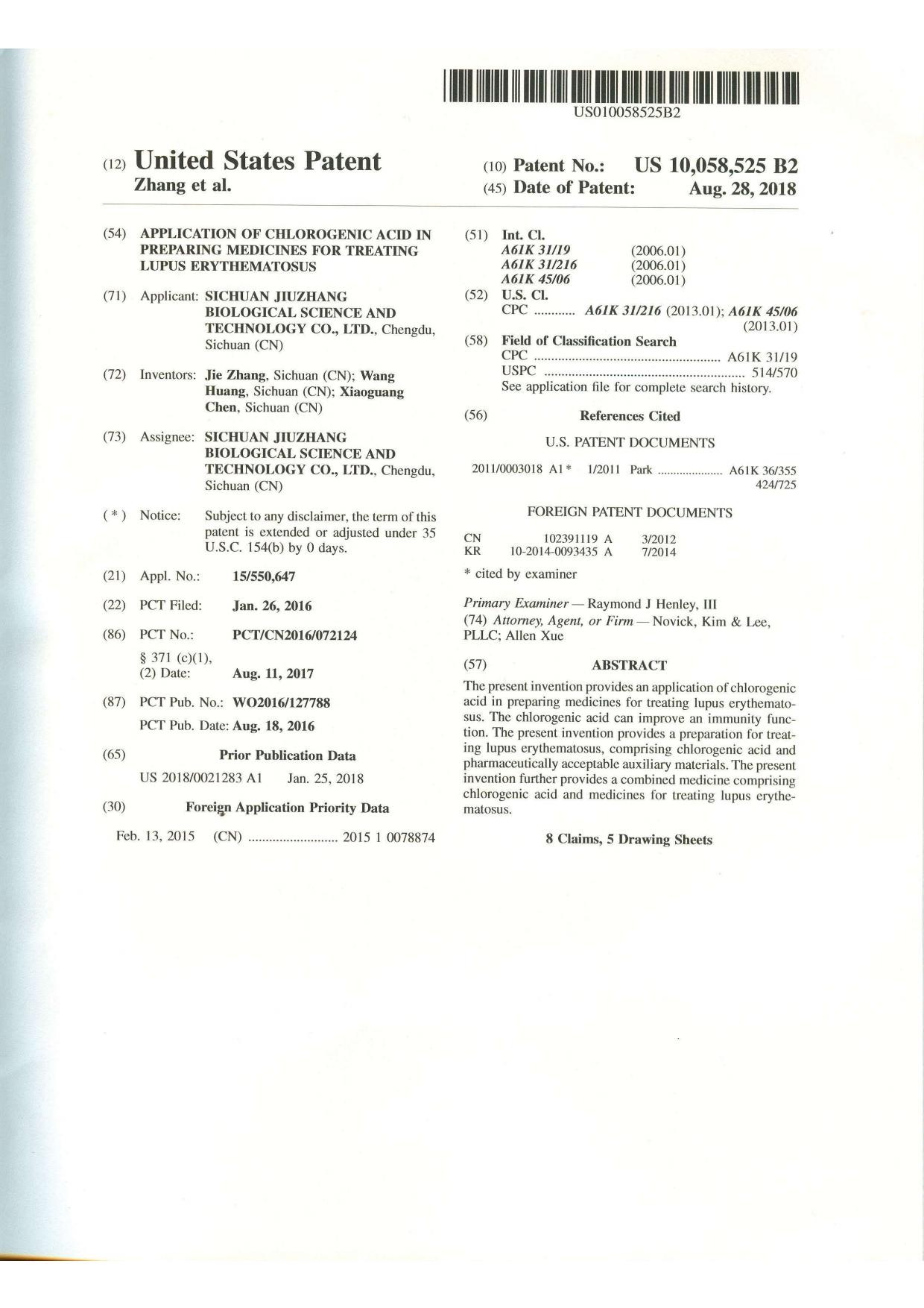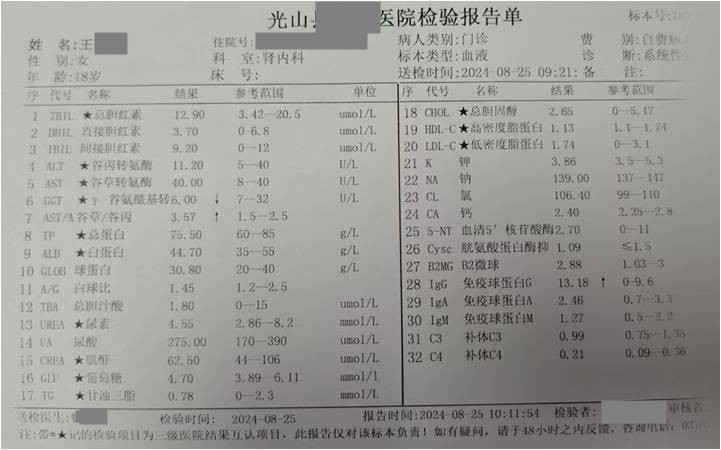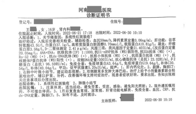 用藥前患者確診為系統性紅斑狼瘡。隨后開始使用激素藥,面部紅斑一直較明顯,1年后,開始單獨使用注射用綠原酸,用藥1年1個月,復查,面部基本無紅斑,免疫指標基本正常。目前已恢復正常,未出現復發,停止使用注射用綠原酸。